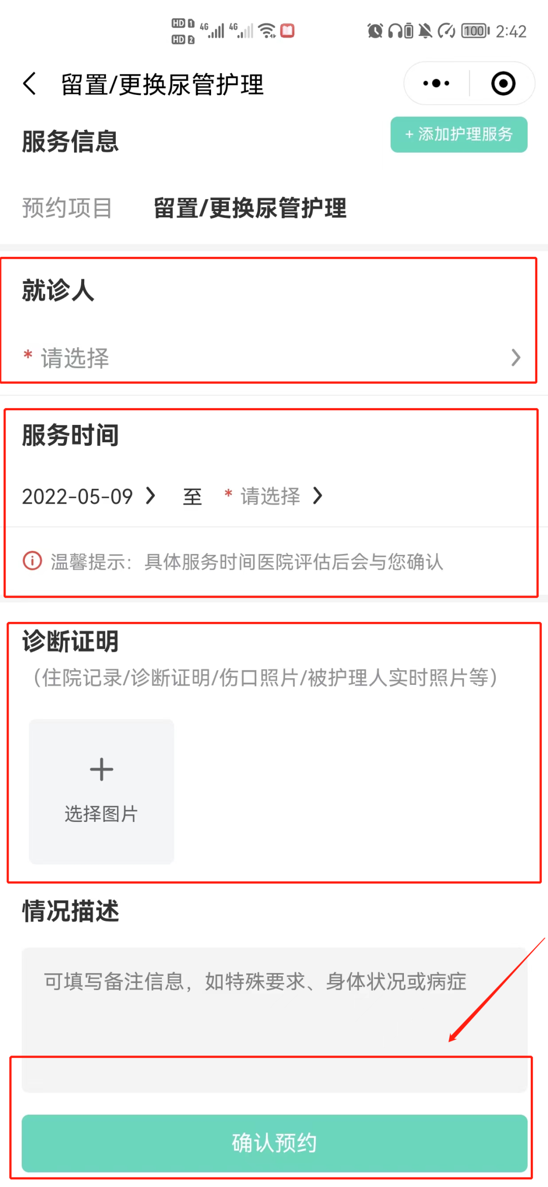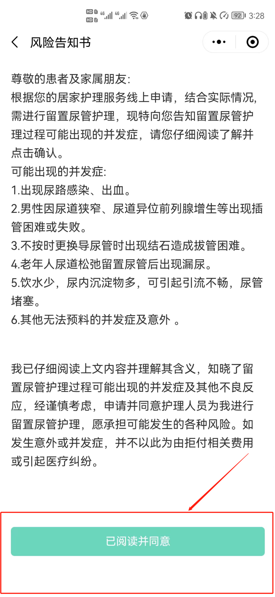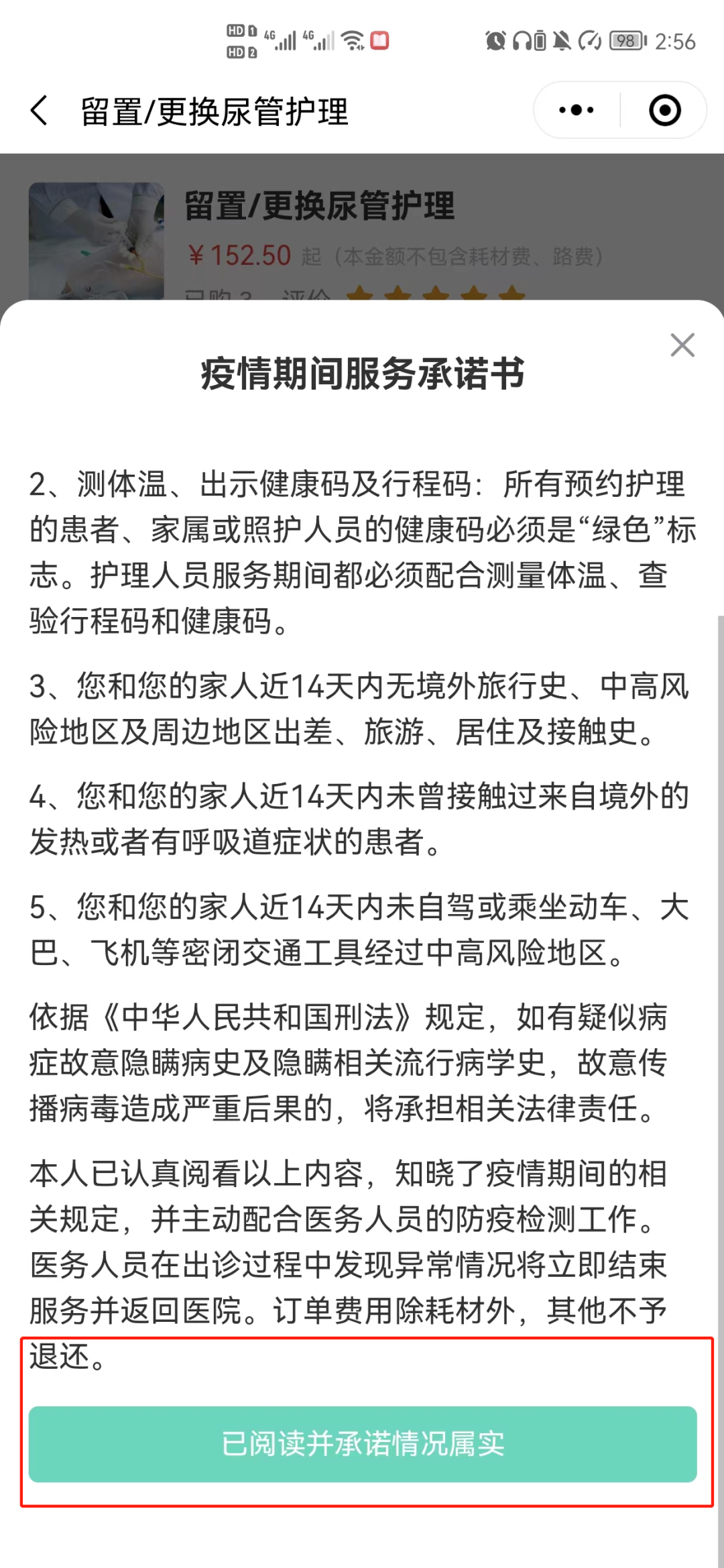第二步:选择护理服务后点击“立即预约”,阅读“疫情期间服务承诺书”后点击“已阅读并同意”