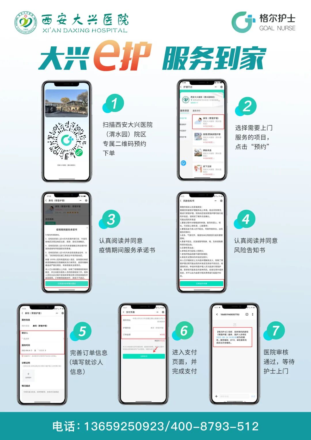 只需通过手机关注“西安大兴医院服务平台“公众号,在其他中选择大兴“e”护,就可以根据需求预约护士上门服务。