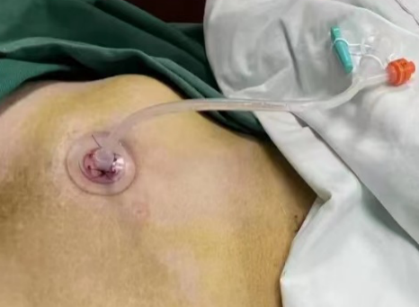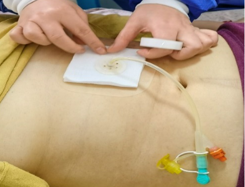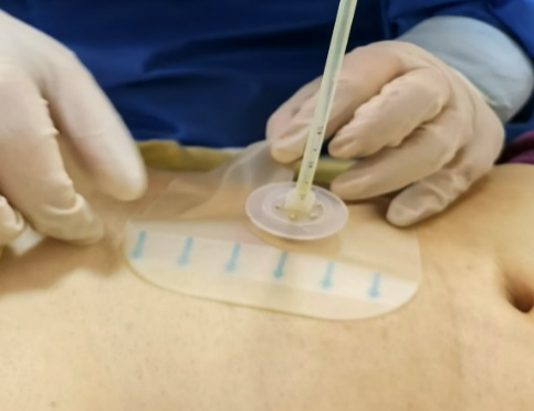 换水前,确定导管在位,即在术中置入的刻度。