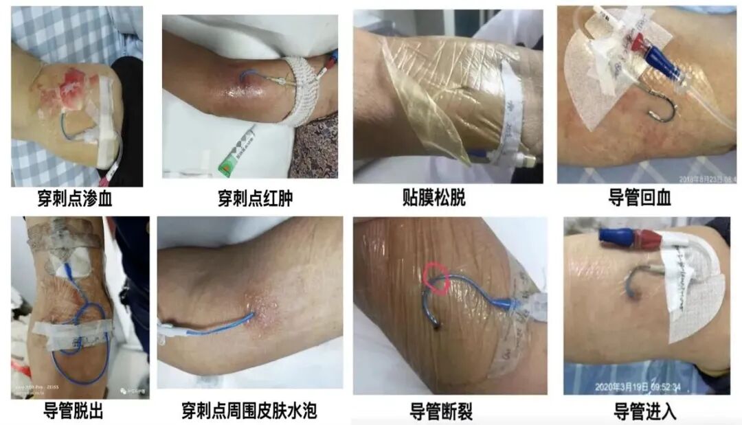 4. 观察导管:有无漏液、折叠、外露管道长度有无脱出或回缩。一旦出现导管折断或者脱出,保持冷静,立即反折导管外露部位或按压穿刺点。