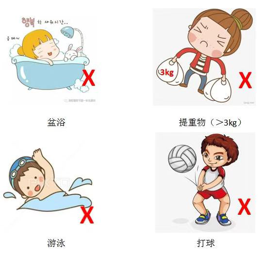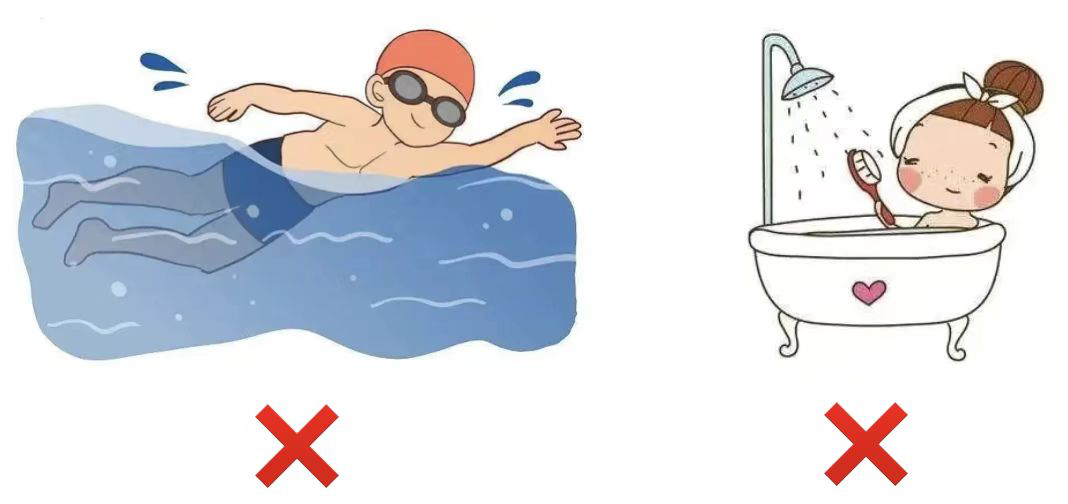 4、严禁游泳,避免盆浴、泡浴。