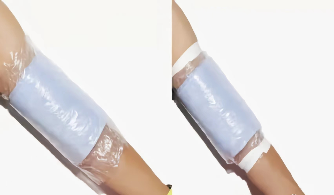 方法一:淋浴前用小毛巾包裹,再用弹力网套包裹小毛巾,最后用保鲜膜保鲜膜,从下到上缠绕手臂,每次压半幅。