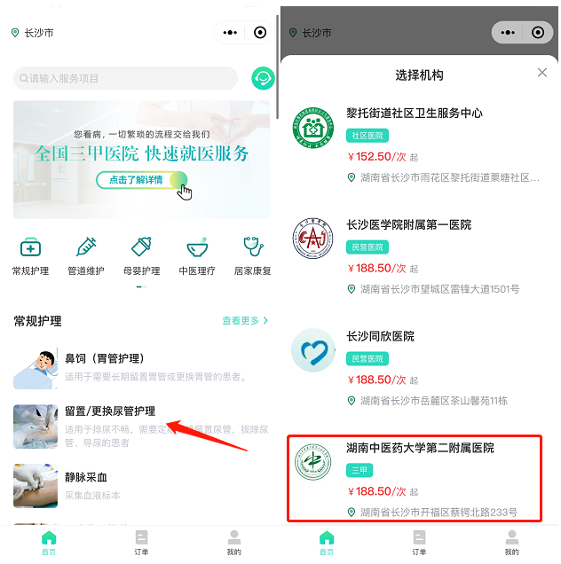 第一步:长按识别上方二维码,进入格尔护士平台,并根据自身情况选择想要预约的上门服务项目,点击进入,选择就近的医院。