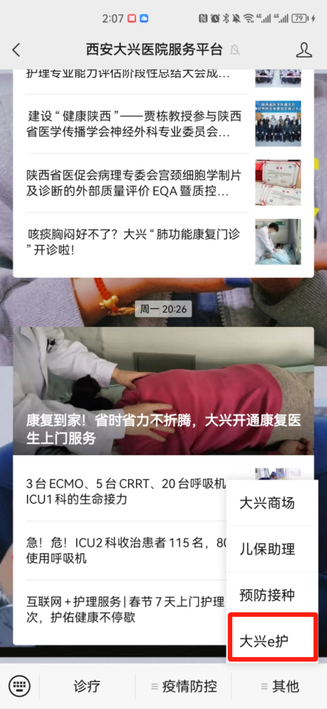 手机关注“西安大兴医院/西安大兴医院服务平台”公众号,在下拉菜单“特色板块/其他”中,点击“护理上门服务/大兴e护”,选择“母婴护理”,就可以根据需求预约。