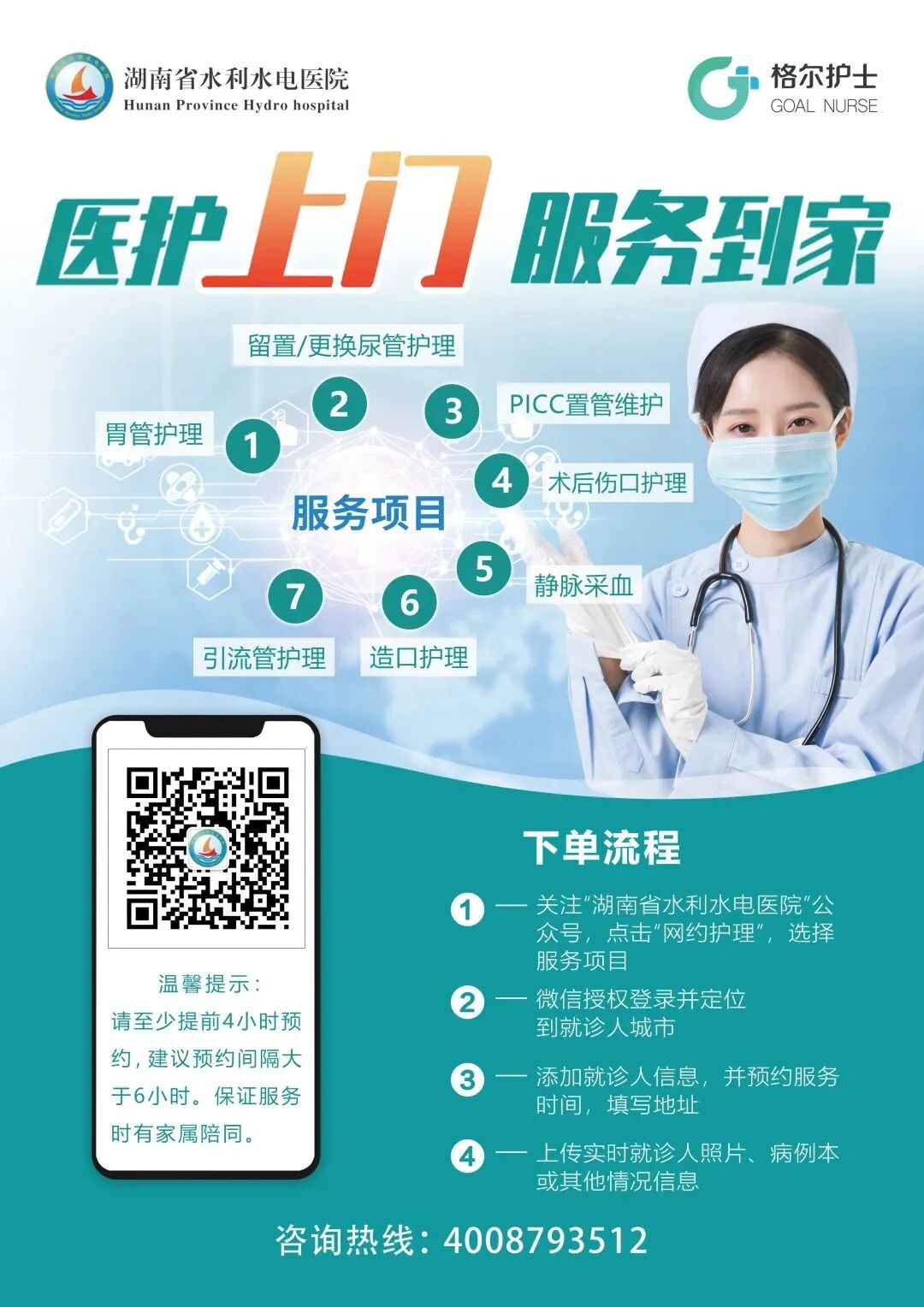 长按扫描下方海报中的二维码关注“湖南省水利水电医院”公众号,点击右下角菜单栏“网约护理”进行预约。
