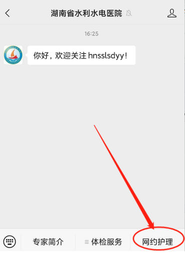 微信搜索“湖南省水利水电医院”公众号并关注,点击右下角菜单栏“网约护理”进行预约。