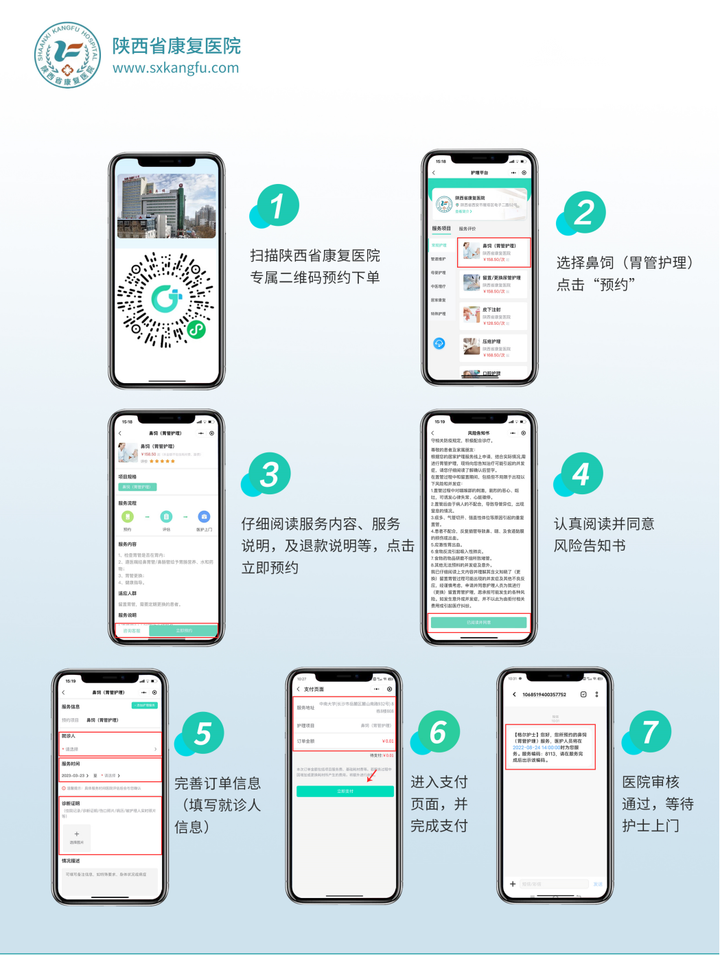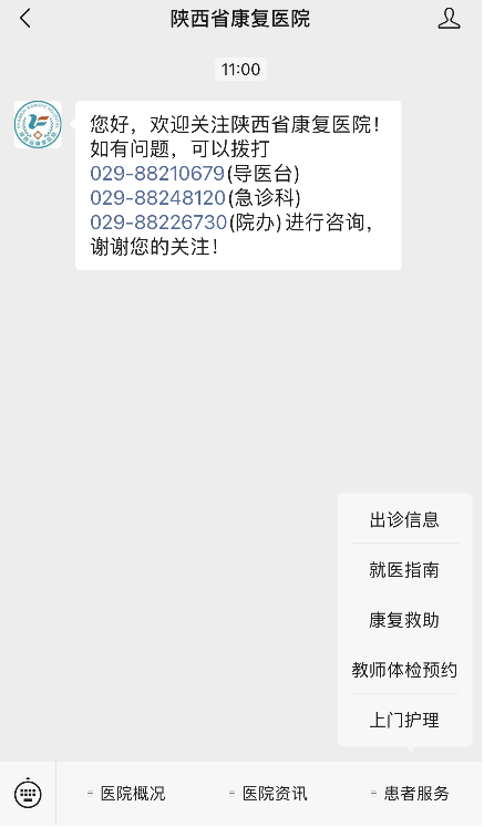 关注“陕西省康复医院”公众号,点击“患者服务”选择上门护理,按照提示操作即可。