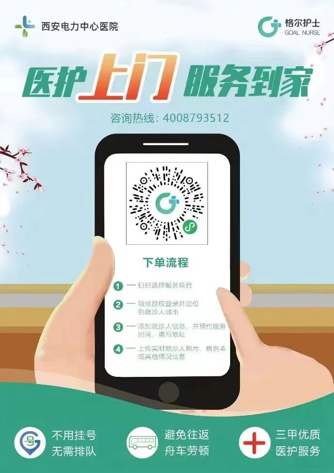 西安电力中心医院近期针对慢性病患者、高龄以及其他特殊人群,推出“护理上门”服务,推动优质医疗资源下沉,延伸至社区及家庭。患者及家属可通过手机下单,足不出户即可获得由我院医护专家团队上门提供的便捷、专业、高效的护理延伸服务。