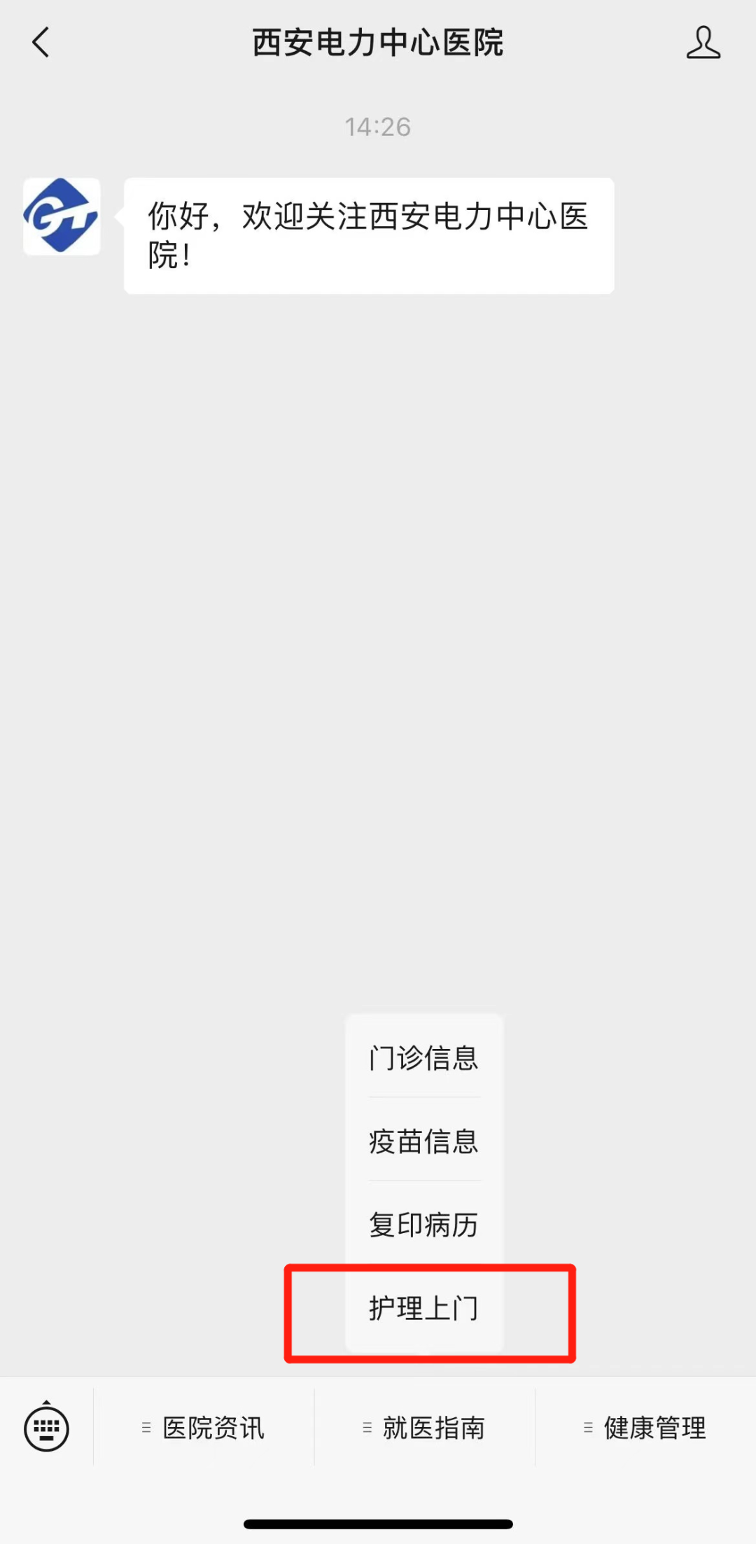 关注“西安电力中心医院”公众号,点击“就医指南”选择护理上门,按照提示操作即可: