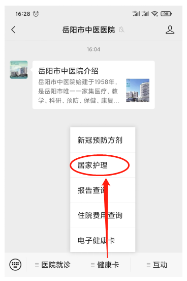 微信关注“岳阳市中医医院”公众号,点击底部菜单栏“健康卡”-“居家护理”进行预约。