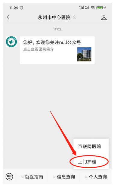 关注微信公众号“永州市中心医院”,点击底部菜单栏“个人查询”-“上门护理”进行预约。
