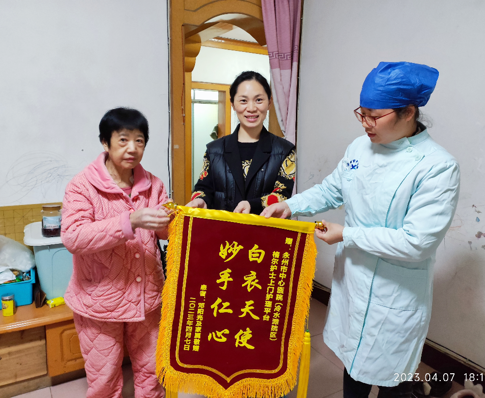 后续,易兰淋又为邓爷爷进行了3次上门护理,和邓爷爷一家建立了良好的信任关系。为了感谢易兰淋一直以来的悉心照护,家属特别制作了一面锦旗送给易兰淋。收到锦旗后的易兰淋很开心:“这是我收到的第二面上门护理服务锦旗!护士平时临床护理工作很忙,还要兼顾上门护理服务,这对我们的工作提出了更高的要求。但是能够利用所学专业知识为行动不便和有需要的患者提供专业的护理服务,我觉得很值得!这是我们白衣天使的职责所在,在服务的过程中也充满了关爱与温暖。上门护理服务能得到患者及家属们的一致好评,让我们更有信心持续提升服务质量,让更多的患者受益。”
