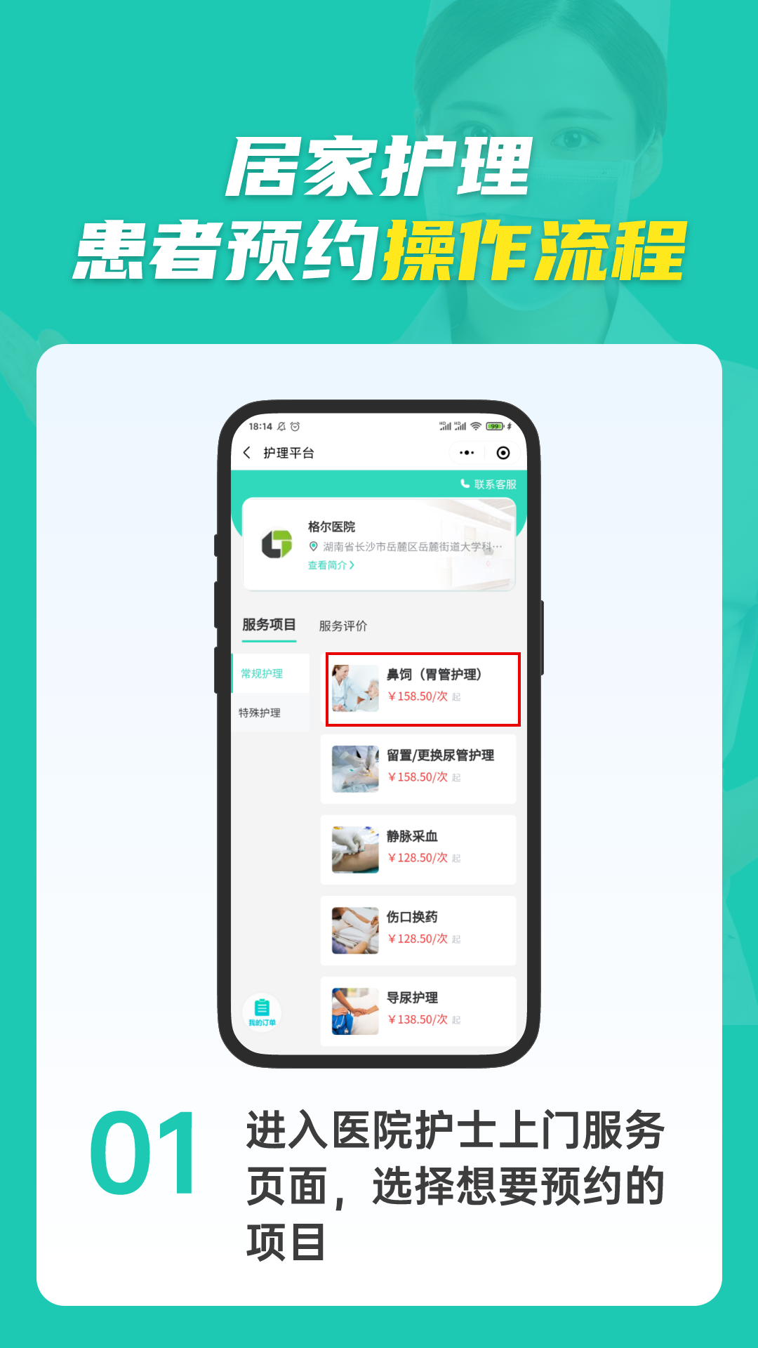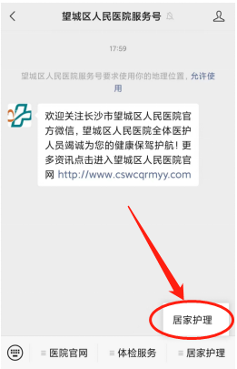 关注微信公众号“望城区人民医院服务号”,点击底部菜单栏“居家护理”进行预约