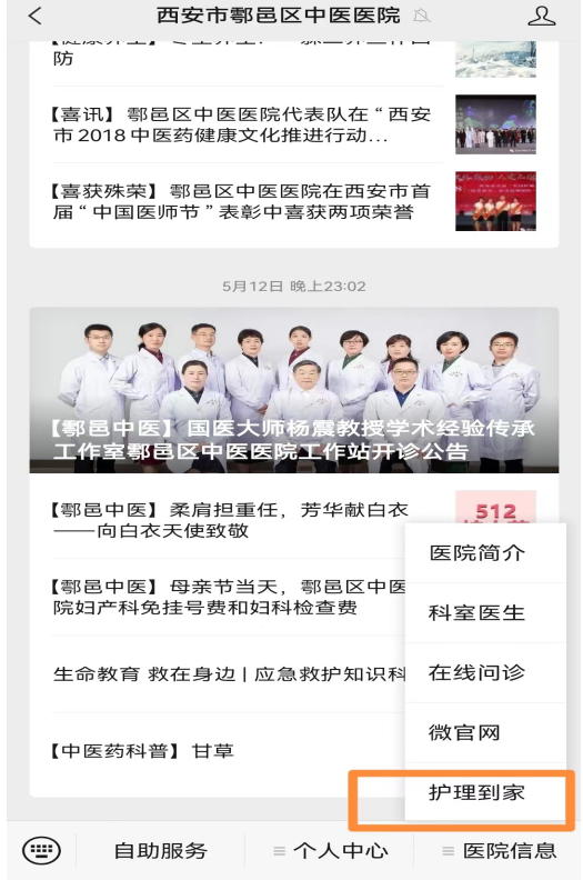 西安市鄠邑区中医医院公众号点击“医院信息”—选择“护理到家”,进行预约;