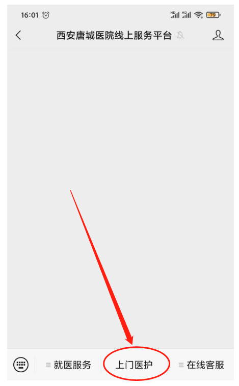 微信关注公众号“西安唐城医院线上服务平台”,点击底部菜单栏“上门医护”进行预约: