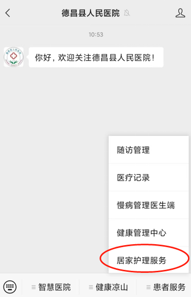 德昌县居民可微信关注公众号“德昌县人民医院”,点击底部菜单栏右侧“患者服务”-“居家护理服务”进行预约