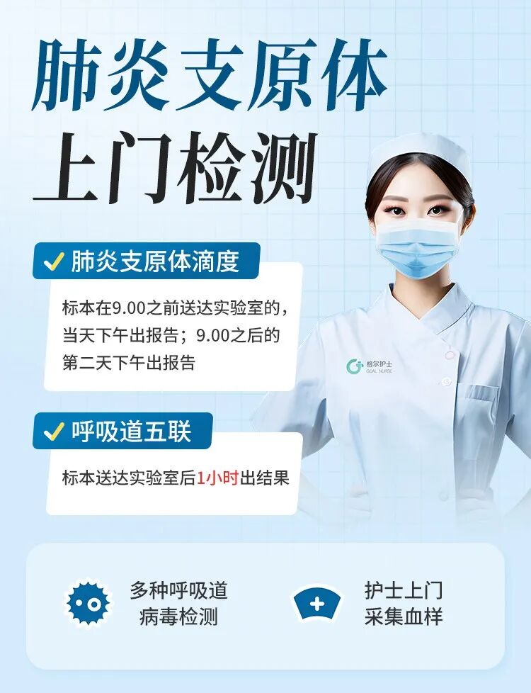 在这个特殊的时期,守护您的健康至关重要。格尔护士的肺炎支原体上门采样检测服务将为您提供专业的医疗服务,让您远离医院拥挤和交叉感染的风险。如果您和您的家人出现了呼吸道症状,不妨试试我们的肺炎支原体上门采样检测服务。我们将为您的健康保驾护航,让您在家中就能得到专业的医疗服务。