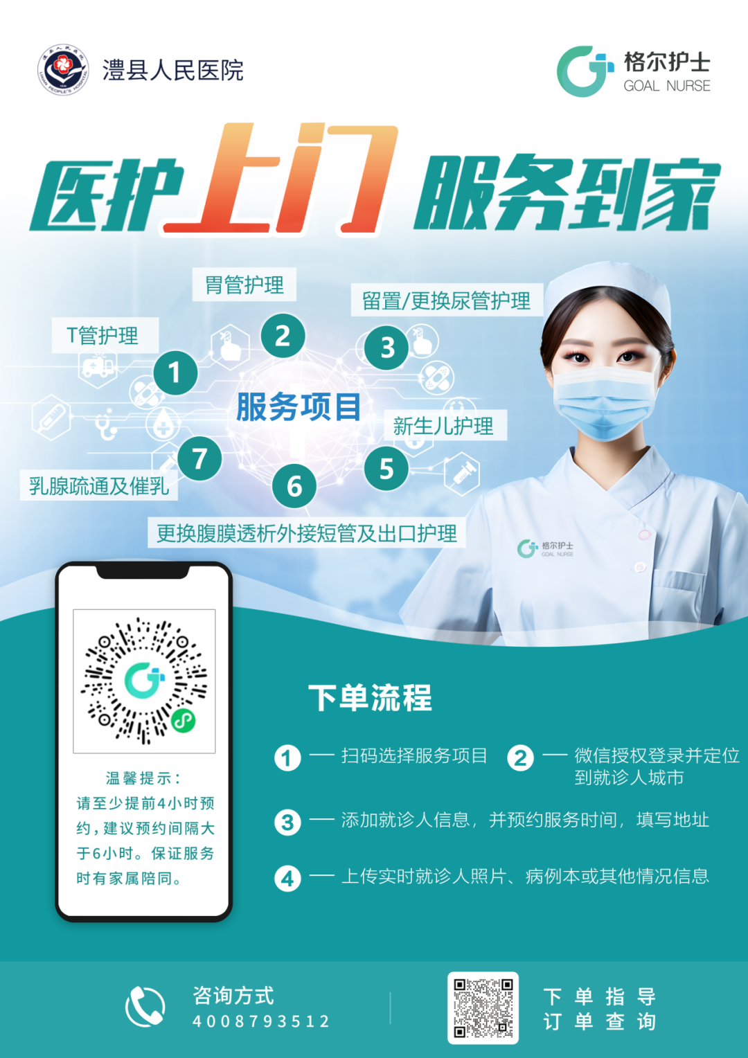 目前,澧县人民医院已经开通了十几余项上门护理服务,满足了不同人群的各种护理需求,包括: