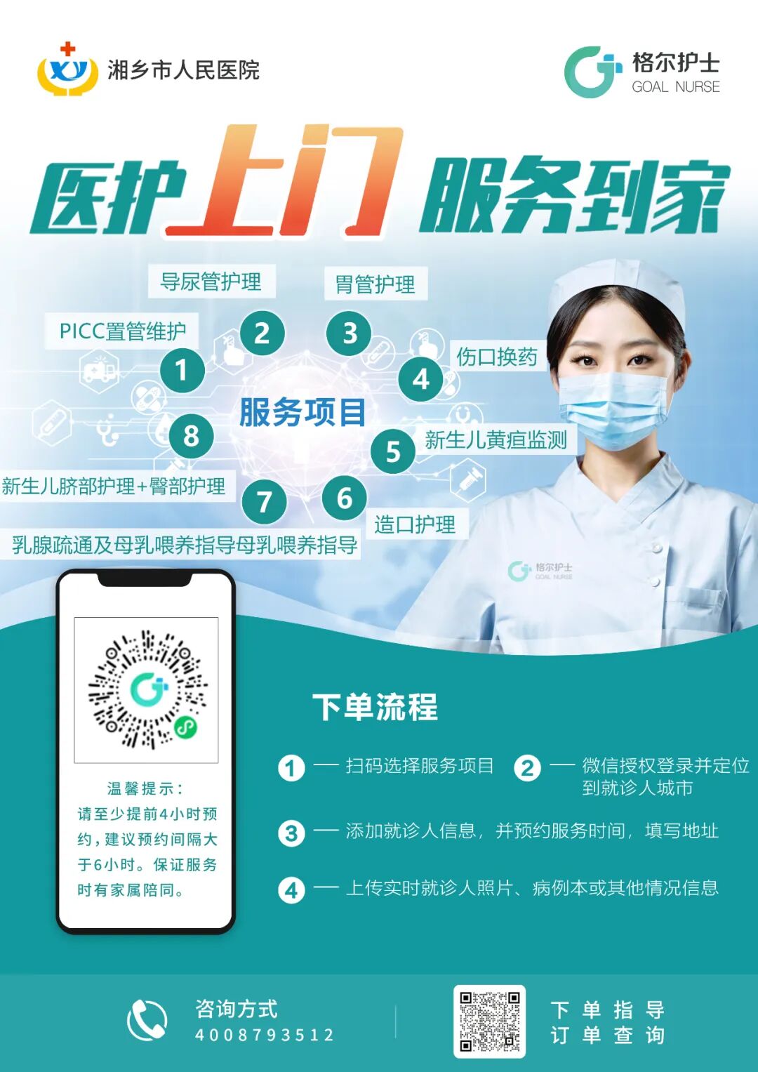 为了追求卓越护理,满足群众日益增长的多元化、多层次的医疗卫生健康需求,湘乡市人民医院对医院护理服务进行全面升级,联合业内知名的格尔护士居家护理服务平台推出“互联网+护理服务”,让出院患者在家也能享受到医院专业的延续护理。该项服务为母婴人群、行动不便、高龄体弱、失能失智等有居家护理需求的人群提供了巨大便利,患者或家属只需手机点一点,便可以在家享受到正规医院高端、专业、贴心的护理服务,免去来回医院奔波之苦!