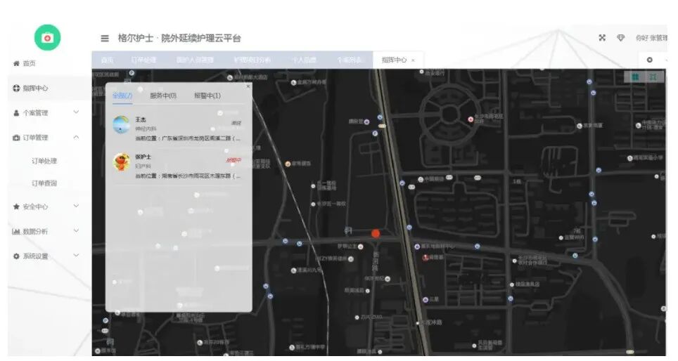 格尔护士平台配置了人员定位系统,通过后台系统可以监控外出护理医护人员的安全状态,可配置紧急联系人,若有紧急情况点击报警按钮,可外呼110报警电话,医院以及平台均会收到报警提醒。