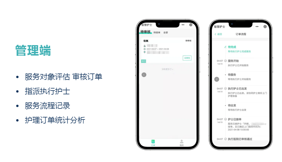 医疗机构入驻平台后,只需专注上门护理服务,无需指派医院内部人员进行维护运营。格尔智慧超8年时间专注延续护理平台的研发,拥有专业的研发团队及智能随访系统和院外管理团队,结合自有专利产品智慧护理系统-“护理知识图谱”,对患者可进行前期护理评估,完成专业的第一层审单。平台从多方面为医疗机构赋能,让医疗机构可以更轻松、高效地处理“互联网+护理服务”业务。