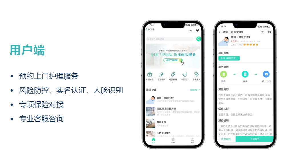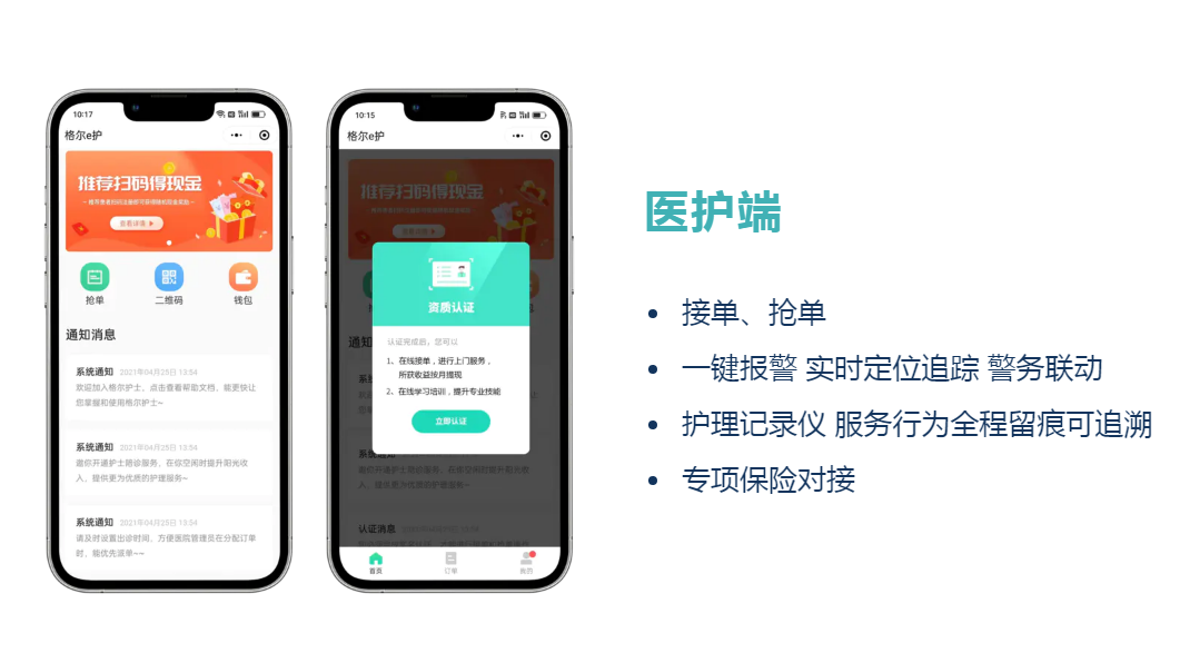 因格尔护士具有平台属性,可实现患者远程咨询、在线下单、护理评估、审核派单等。同时格尔护士还可通过人工智能系统对用户进行真实性评估,从而保证患者的真实性、订单的安全性、程序的合规性。