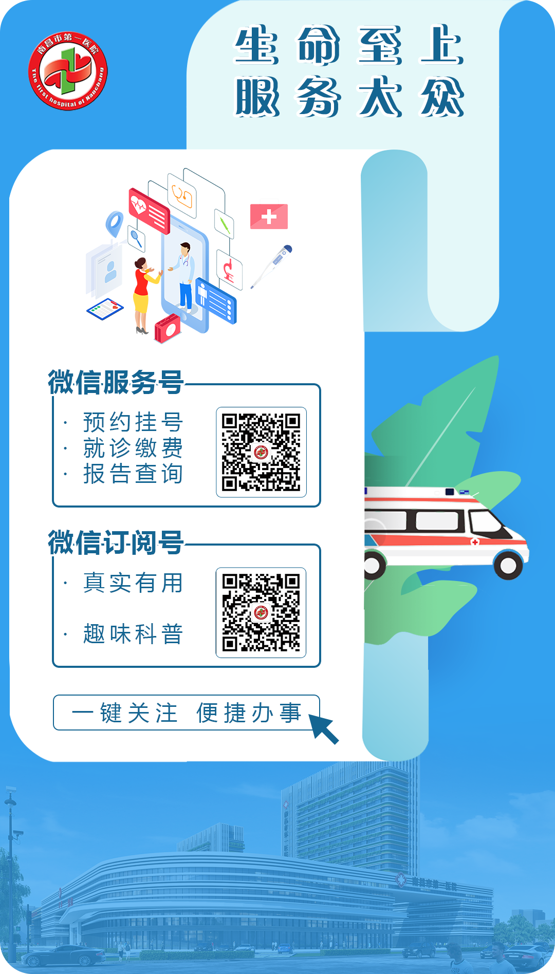 第一步:微信搜索“南昌市第一医院服务号”,关注后,点击智慧服务→居家护理;