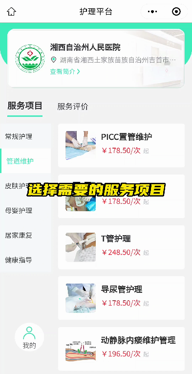 PICC维护、植入式输液港(PORT)维护、淋巴水肿护理、T管维护、糖尿病健康指导(成人)、胰岛素皮下注射、静脉采血、护士上门维护胰岛素泵、透析专用中心静脉导管维护、动静脉内瘘维护管理、导尿管护理、成人造口护理、伤口换药、压疮护理、新生儿臀部护理、新生儿脐部护理、新生儿黄疸测定、新生儿造口护理、儿童早期养育指导、新生儿护理、母乳喂养指导、产后会阴伤口护理、儿童造口护理等。