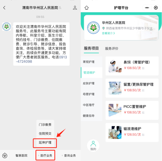 关注“华州区人民医院”微信公众号,点击底部菜单栏中间“医疗业务”-“延伸护理”进行预约。