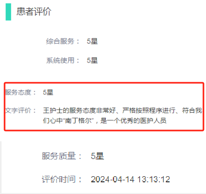 此次服务在综合评价、服务态度、服务质量、系统使用等方面给出非常满意的反馈,得到家属的高度认可。患者家属还表示,通过“互联网+护理服务”,不仅减少了患者往返医院的奔波,还能在最短时间内得到专业的护理服务。