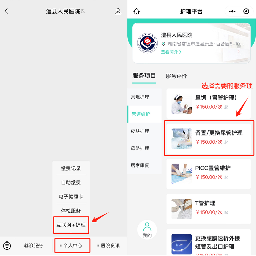 关注“澧县人民医院”微信公众号,点击底部菜单栏“个人中心”-“互联网+护理”进行预约。