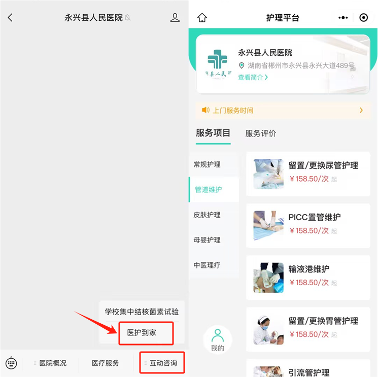 关注“永兴县人民医院”微信公众号和,点击底部菜单栏“互动咨询”-“医护到家”进行预约。