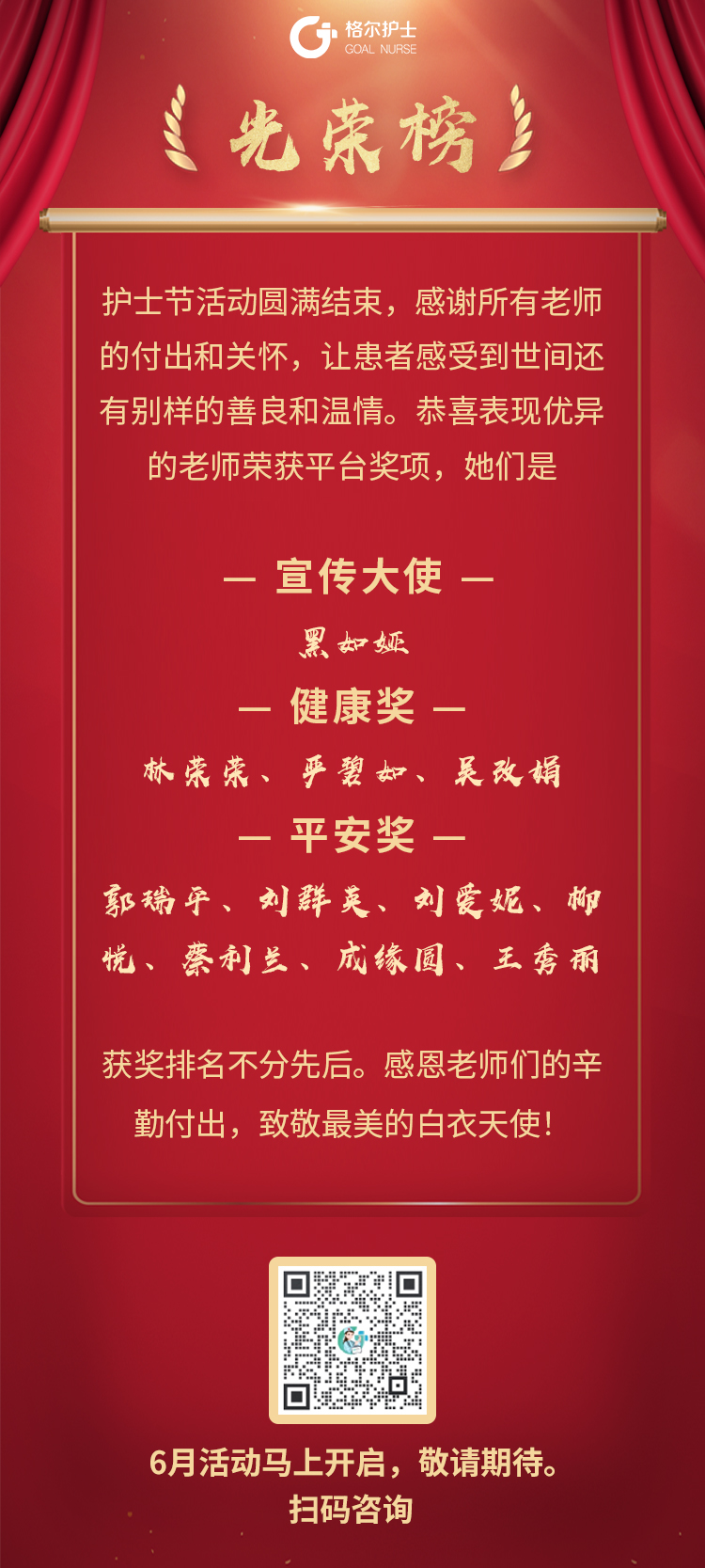 今天,我们特别荣幸地宣布,在本次活动中,有十一位护士老师凭借出色的表现荣获平台奖项,她们是: