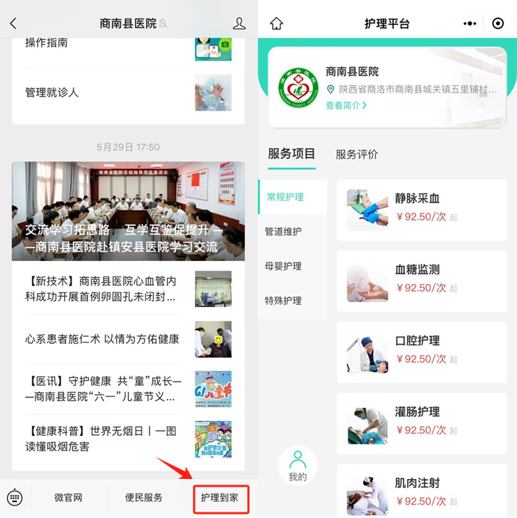 关注“商南县医院”微信公众号,点击底部菜单栏“护理到家”进行预约。