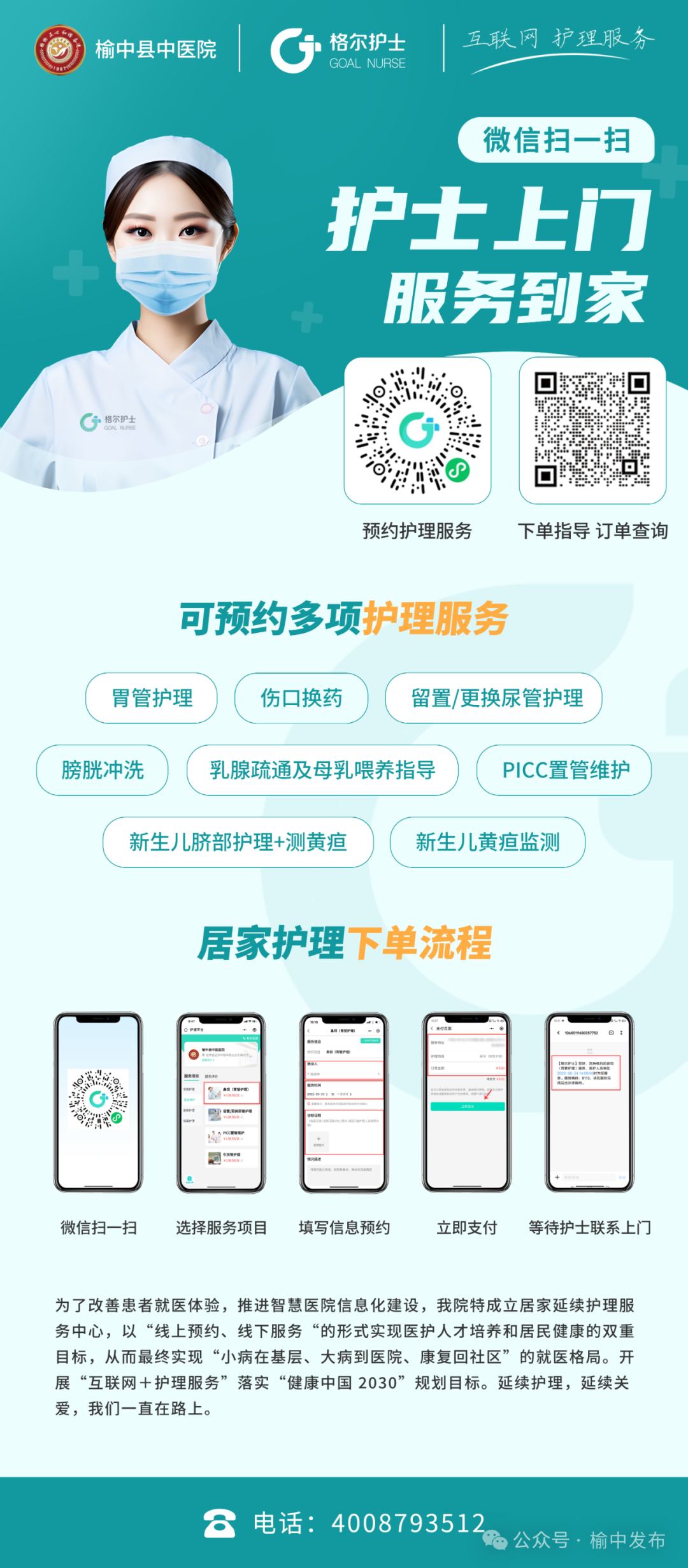 格尔护士 400-8793-512 搜索 扫码下单 格尔护士 热门文章 榆中快讯丨榆中县中医院率先开展“互联网+医护服务” 榆中快讯丨榆中县中医院率先开展“互联网+医护服务” 格尔护士 格尔护士 微信号 gh_42b12a0614b6 功能介绍 格尔护士作为深耕护理行业十余年的“上门护理”服务平台,与全国数千家医院合作,为老百姓提供专业、放心的上门护理服务。咨询:400-8793-512 为进一步提升优质医护服务水平,丰富医护服务渠道,精准对接人民群众多样化、多层次的健康需求,延伸优质医护服务内容,榆中县卫生健康局紧盯群众看病就医急难愁盼,以开展群众身边不正之风和腐败问题集中整治工作为契机,在县中医院探索开展“互联网+医护服务”,为全县患者提供更便捷、更高效和个性化医护服务,帮助人民群众消除后顾之忧,实现数据多跑路,患者少跑腿。 “互联网+医护服务”作为新兴的健康服务方式,突破了传统医疗卫生服务的局限性,依托互联网等信息技术,以“线上申请、线下服务”的模式为主,以“上门护理+健康指导”为基础,有效地将专业的医护服务从院内延伸到百姓家中,面向广大人民群众,为出院患者、老年患者及有特需医疗护理需求的患者提供老年护理、母婴照护、慢病管理、康复护理、中医理疗等连续性医护服务,满足人民群众日益增长的多样化医护服务需求。 截至目前,县中医院已开展常规护理、灌肠、鼻饲(胃管护理)、伤口换药、母婴照护、针灸、刮痧、推拿、拔罐等25个医护服务项目,通过患者线上申请,医护人员上门服务102人次,既解决了众多患者的燃眉之急,又减少了患者及家属来回奔波、挂号缴费的麻烦,在省时省力省心的同时,还让患者足不出户就享受到专业人员一对一的健康服务。 内容来源:榆中县中医院 The End 格尔护士作为深耕护理行业十余年的“上门护理”服务平台,与全国数千家医院合作,为老百姓提供专业、放心的上门护理服务。服务涵盖常规护理、管道维护、母婴护理、中医理疗、居家康复、特殊护理等六大类300多个项目,覆盖全国31个省市及地区,让您居家也能享受到5年以上临床经验的专业护士上门护理。仅需手机点一点,省时省力又省心,上门护理就找格尔护士! 咨询热线:400-8793-512 “格尔护士”居家护理服务平台 预览时标签不可点 微信扫一扫关注该公众号 继续滑动看下一个 轻触阅读原文 格尔护士 向上滑动看下一个 知道了 微信扫一扫 使用小程序 取消 允许 取消 允许 : , 。 视频 小程序 赞 ,轻点两下取消赞 在看 ,轻点两下取消在看 分享 留言 收藏