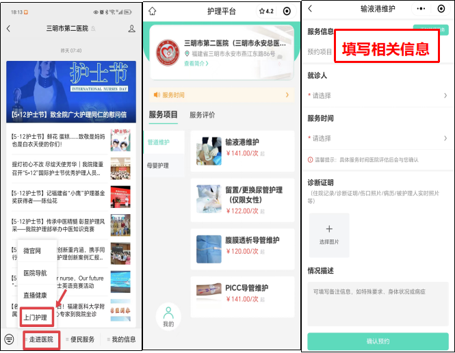 关注“三明市第二医院”微信公众号,点击底部菜单栏“走进医院”-“上门护理”进行预约。