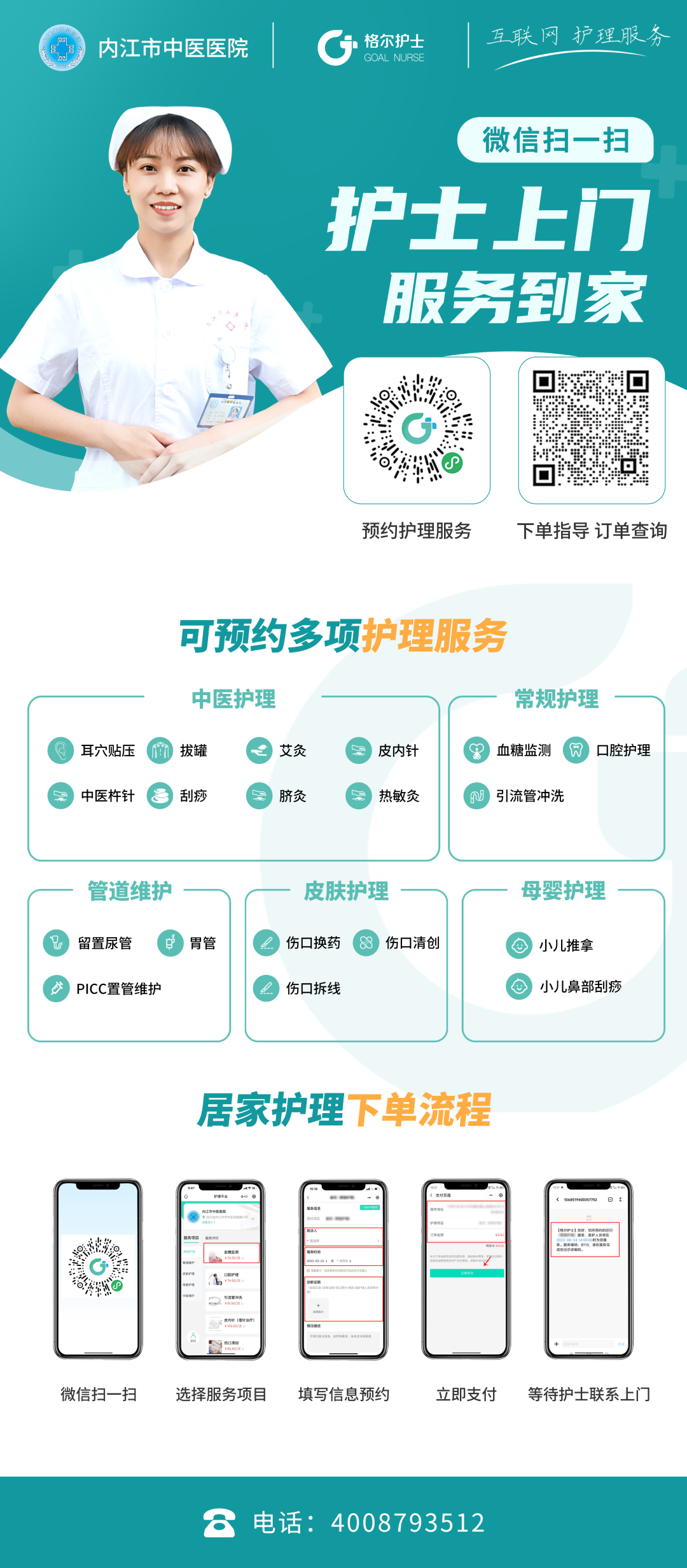 除内江市第二人民医院外,内江市中医医院也开展了护理上门服务。