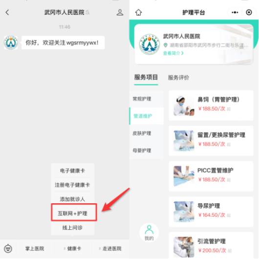 如果您也想预约护士上门护理服务,只需微信关注“武冈市人民医院”微信公众号,点击底部菜单栏中间“健康卡”-“互联网+护理”,进入格尔护士平台,选择“需要的服务项”进行预约。