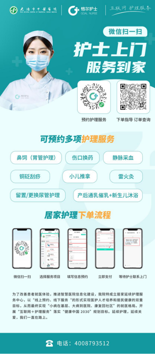微信关注“大冶市中医医院”公众号,点击底部菜单栏“线上服务”-“护理上门”进入格尔护士平台,选择“需要的服务项”进行预约。