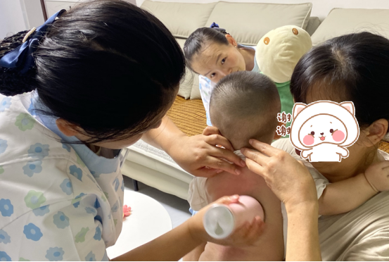 上周,我院“互联网+护理服务”平台的正式上线,迎来了首次上门服务——小儿推拿。接到平台派单后,儿科护士长张焕和专科护士胡小翠立即入户,在对宝宝的情况进行详细评估询问后了解到宝宝主要是厌食、大便干结。胡小翠立即针对宝宝出现的症状进行推拿,操作手法轻快、柔和、平稳,取穴准确,张焕通过和宝宝玩玩具、唱儿歌、做游戏等多种方式与宝宝互动,和宝宝营造亲近感,很好的减轻了宝宝哭闹的问题。