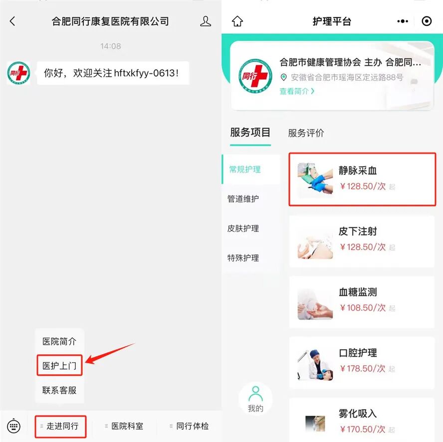 微信关注“ 合肥同行康复医院有限公司”公众号,点击底部菜单栏“走进同行”,点击“医护上门”,进入格尔护士平台,选择“需要的服务项”进行预约。