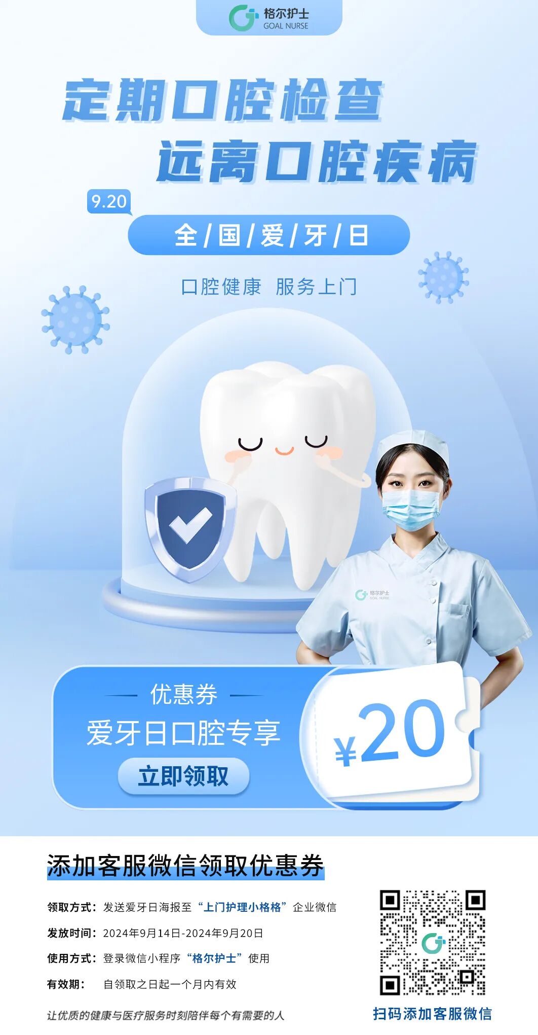 为庆祝全国爱牙日,格尔护士平台特别准备了20元优惠券,专享口腔健康服务。无需排队挂号,无需长途奔波,只需轻轻一点,专业护理人员便能如约而至,为您和家人提供全方位的口腔检查与咨询服务。