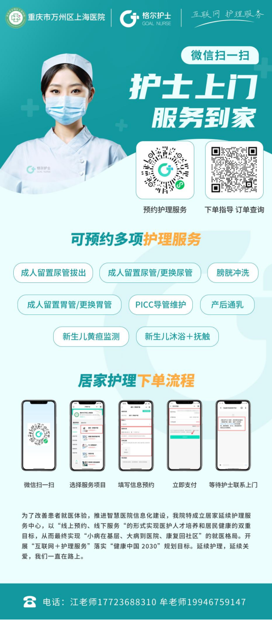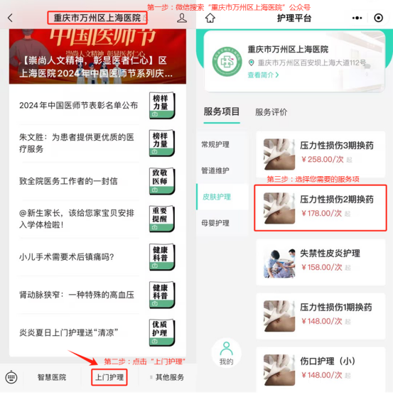 微信关注“重庆市万州区上海医院”公众号,点击底部菜单栏“上门护理”进入格尔护士平台“选择您需要的服务项”进行预约。