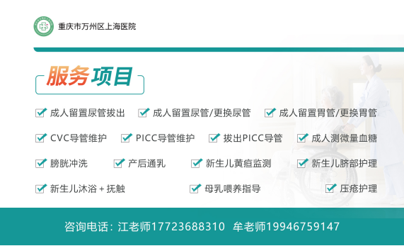 目前,我院已开通的上门护理服务包括:成人留置尿管拔出、成人留置尿管/更换尿管、成人留置胃管/更换胃管、CVC导管维护、PICC导管维护、拔出PICC导管、压疮护理、成人测微量血糖、膀胱冲洗、产后通乳、新生儿黄疸监测、新生儿脐部护理、新生儿沐浴+抚触、母乳喂养指导等。提供上门服务的护士,均是各专业的专科护士、护士长或护理骨干,具有丰富的临床经验,较高的专科护理技术水平以及过硬的护理综合素质。