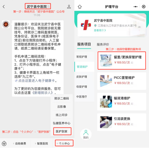 微信关注“武宁县中医院”公众号,点击底部菜单栏“个人中心”-“医护到家”进行预约。