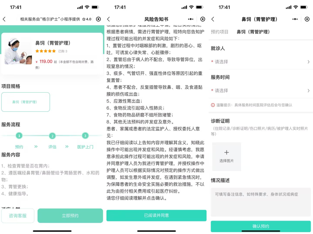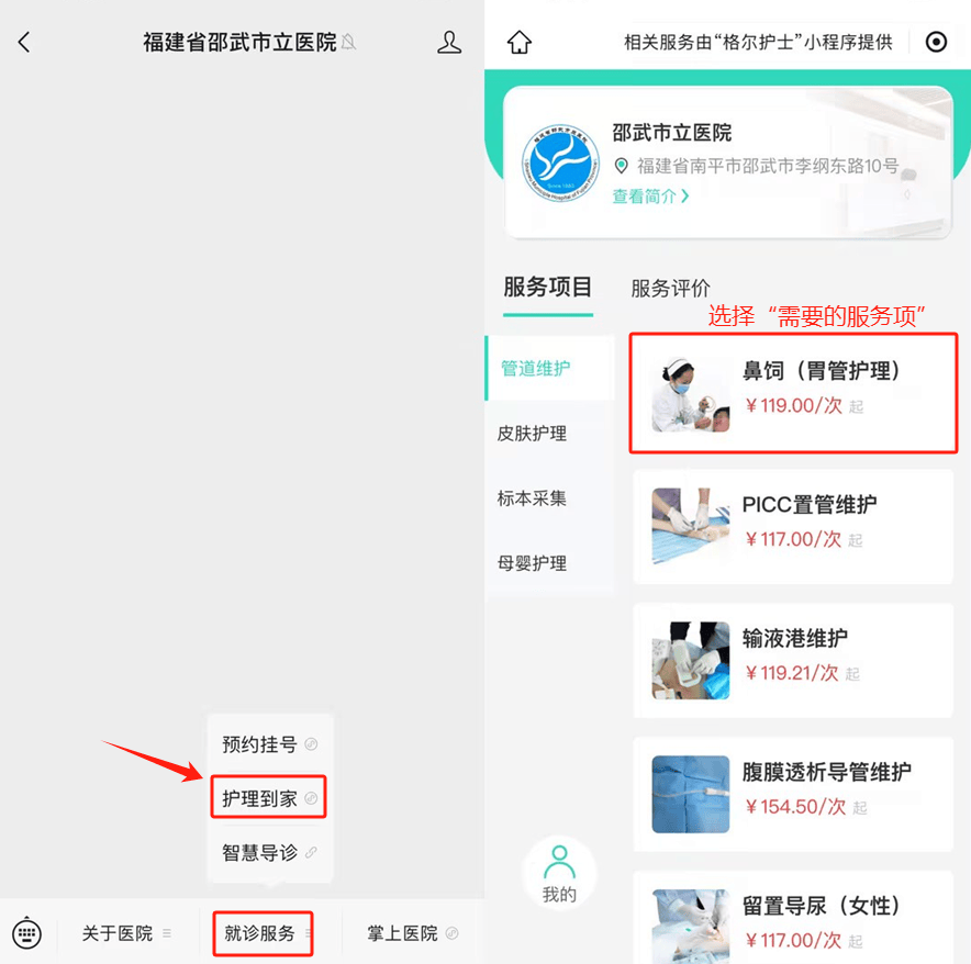 患者下单流程:微信关注“邵武市立医院”公众号→点击“就诊服务”→“护理到家”→进入格尔护士平台→选择服务项目→填写订单→选择上门服务时间→选择联系人→上传就医证明等→确认下单。