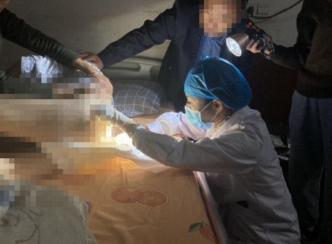 81岁的刘奶奶因脑梗塞伴右侧股骨骨折入住我院骨科。病情稳定后,刘奶奶于7月30日从医院出院。出院后右侧肢体需继续外固定3个月,只能卧病在床。由于翻身会导致病人疼痛难耐,加上家属照顾缺乏经验,10月24日,家属发现刘奶奶骶尾部、左足跟部局部皮肤出现紫黑色改变,皮肤组织已经有深度坏死。面对老人的病痛,家属们既心疼又无奈。得知桃源县人民医院有开展上门服务,便通过格尔护士平台上预约了一单“压疮护理服务”。护理部管理员接到订单后,立即指派伤口治疗师李纯护士长上门服务。李纯护士长与另一名伤口造口师林品君主管护师不顾下班后的疲劳,于 18:50一同驱车前往患者家中。到达患者家中已经是19:20。
