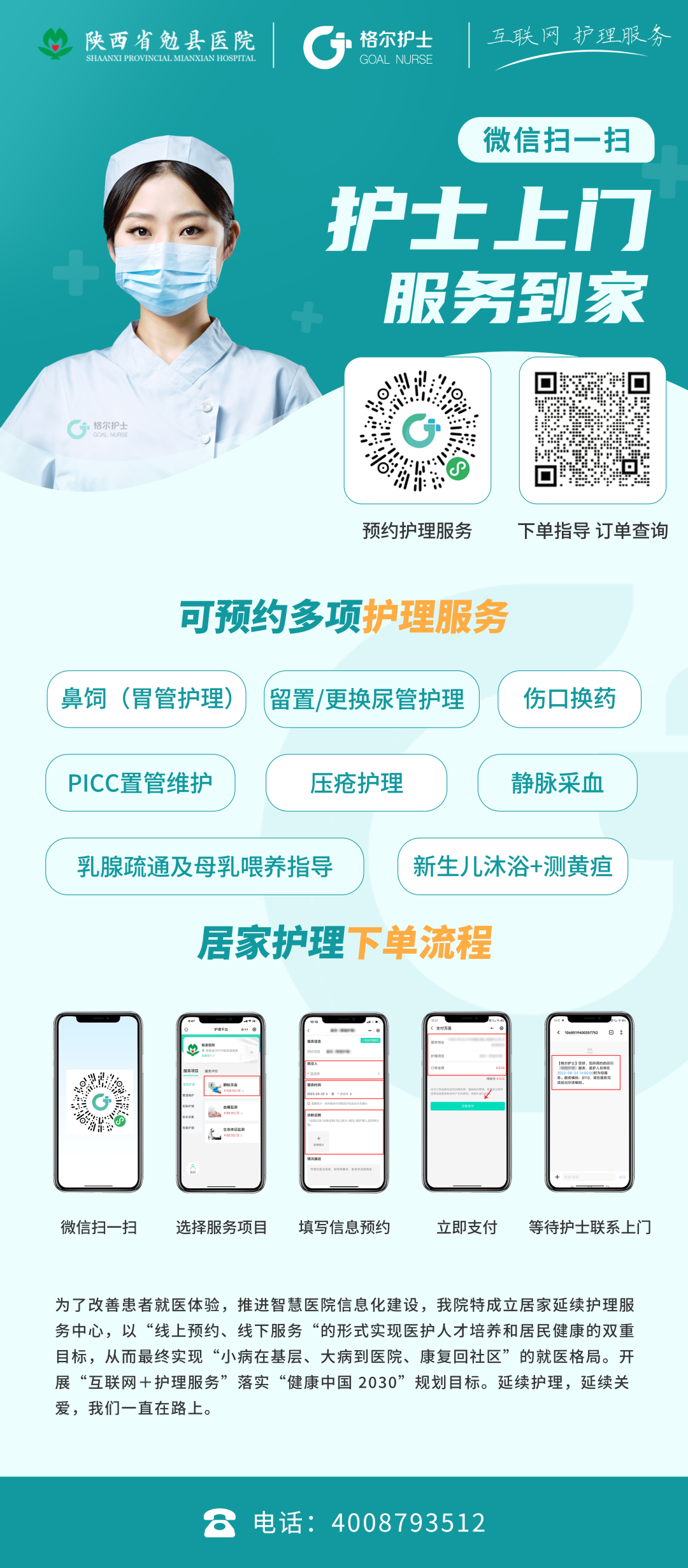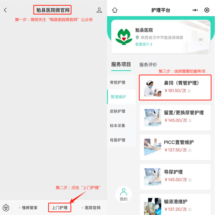微信关注“勉县医院微官网”公众号,点击底部菜单栏“上门护理”→进入格尔护士平台→选择服务项目→填写订单信息→选择上门服务时间→上传就医证明等→确认下单。