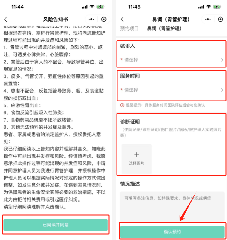 第三步:阅读风险告知书后点击“已阅读并同意”,填写就诊人信息,并点击“确认预约”。
