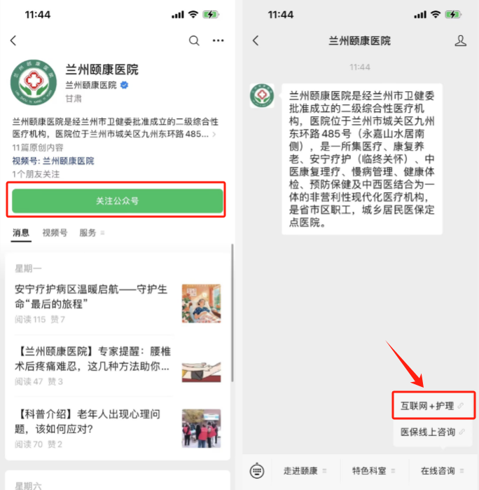 第一步:微信关注“兰州颐康医院”公众号→点击“在线咨询”→“互联网+护理”进入格尔护士平台。